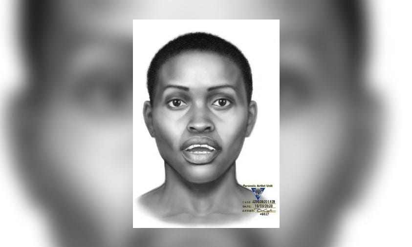 By November 2020, a composite sketch of what Jane Doe may have looked like was released, along with a photo of a vehicle of interest. The image seems to have been captured by surveillance cameras and is described as a "light-colored Toyota Highlander with brightly polished rims and a roof rack." The model year is between 2000 and 2006.