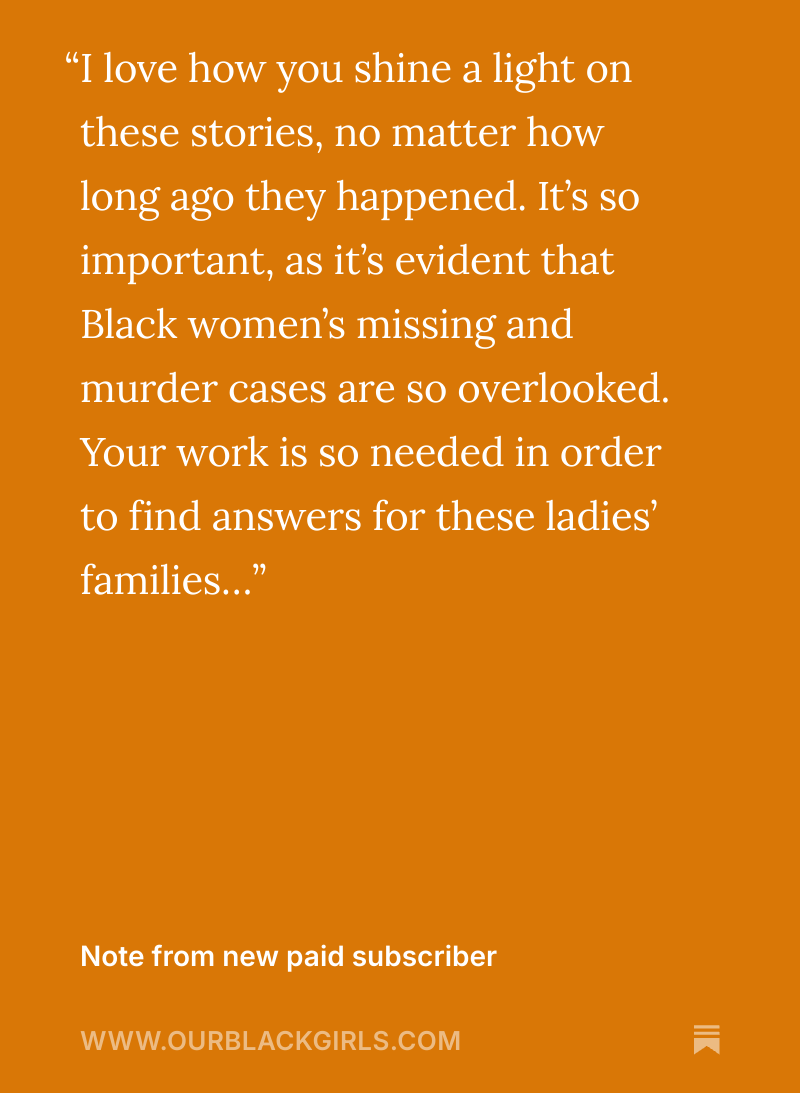 Our Black Girls was created to give voice to the missing, the overlooked, and the silenced. Over time, the work has gathered a community that cares deeply about remembrance and justice. The notes you see here come directly from readers. Each one is a reminder that this space matters, and that the stories of Black women and girls deserve to be honored. Thank you for standing with me and becoming a part of the OBG community.