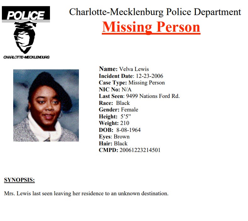 Anyone with information regarding Velva's disappearance is urged to contact the Charlotte-Mecklenburg Police Department at 704-336-2311, Crime Stoppers at 704-334-1600, or their local authorities. The agency case number is 20061223214501.